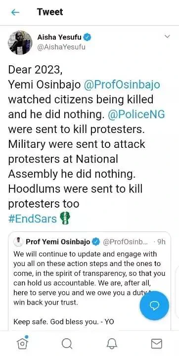 Prof Yemi Osinbajo was blasted by so many Nigerian youths for keeping quiet for a long while, before finally speaking up. Aisha Yesufu, one of the great pioneers of the #EndSARS movement replied Prof Yemi Osinbajo on her official Twitter account, as she expressed displeasure regarding what the vice-president said: